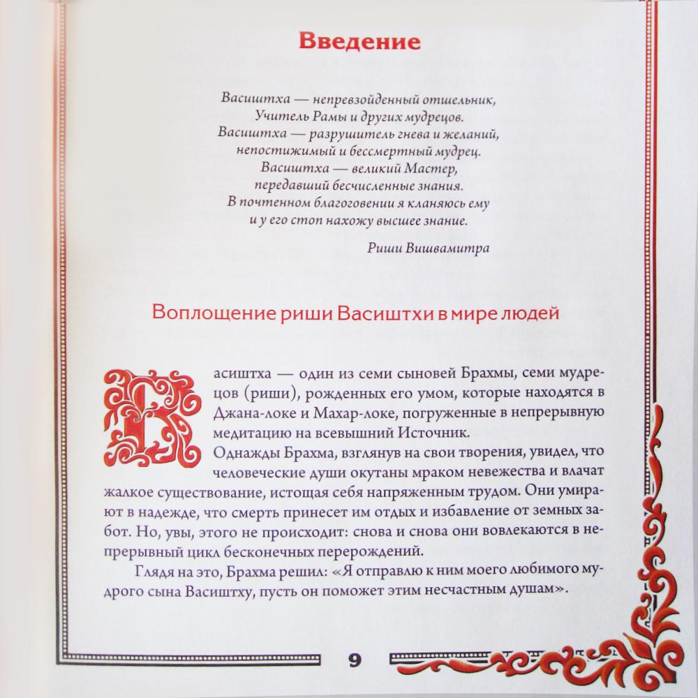 В этом учении Васиштха раскрыл тайные методы и философию Вед. Оно приносит большую пользу не только серьезным духовным искателям, религиозным деятелям, философам, ученым, но и обычным людям, заинтересованным в построении нормальных отношений с окружающими и самим собой, желающим достичь гармонии и готовым вкусить плоды вечной Истины. Эта книга является методическим пособием по достижению состояния Просветления. Только в этом состоянии человек становится по-настоящему счастливым и свободным, только это состояние принесет ему мир, покой и освобождение. Здесь даны практические знания, которые необходимы человеку, чтобы разобраться во многих сложных и, казалось бы, неразрешимых проблемах, встающих на его пути. Знания, изложенные в книге, раскрывают перед человеком такой огромный спектр вопросов, что он поневоле спрашивает себя, как он мог жить раньше без этой информации. Васиштха говорит, что человек постигает глубину мудрости данных знаний простым изучением этой книги, обретая при этом ни с чем не сравнимое состояние радости и блаженства, которое приносит познание Истины.